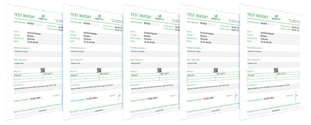 Every batch is analytically verified with HPLC to be up to the higheststandards in purity, active weight content, and identity.Test results are publicly available for your viewing on the Lab Tests page, andeach report can be verified authentic with the testing lab.